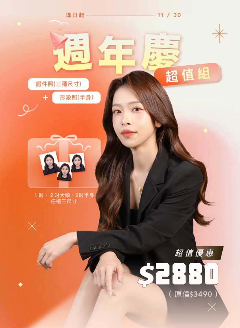 週年慶超值組:證件照(3種尺寸)+職業形象照(半身)