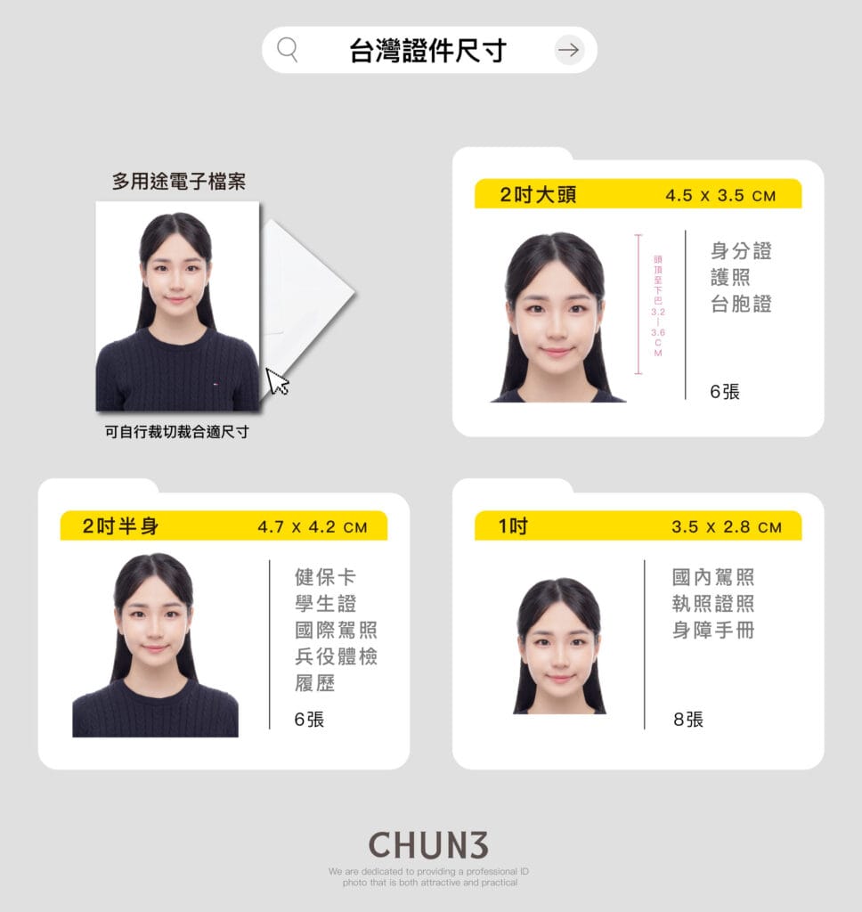 | 台灣護照 | 3.5×4.5 cm | 白底 | 不能修圖過度、要自然表情 |