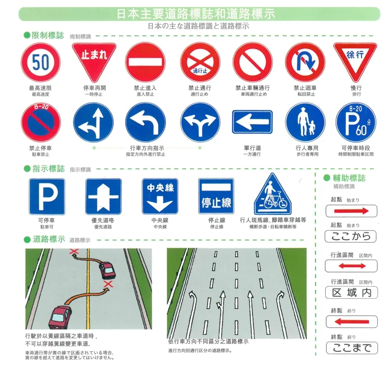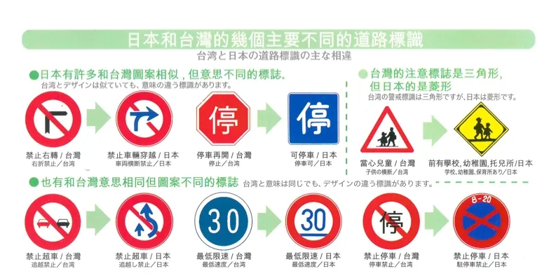 日本和台灣有一些不同的道路標誌,在出發前可以稍微認識一下,以免上路的時候緊張,沒看清楚就違規了!