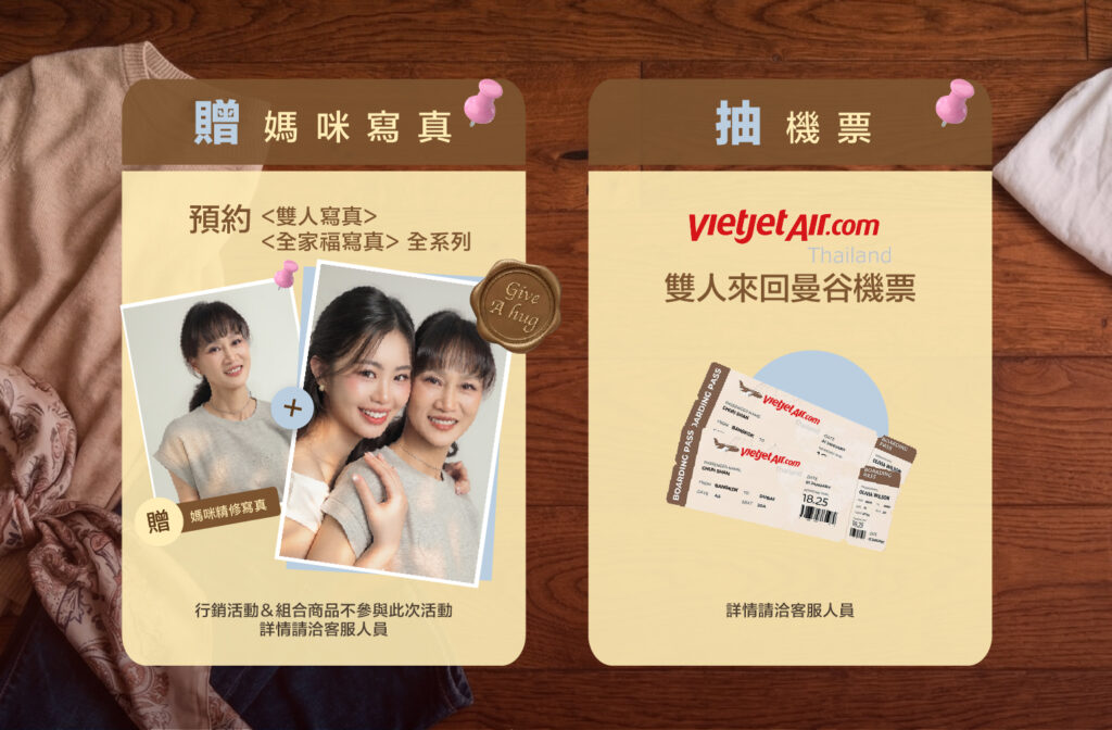 選購「雙人寫真/多人寫真」,並且帶媽媽前往拍攝,即可享有以下好禮!