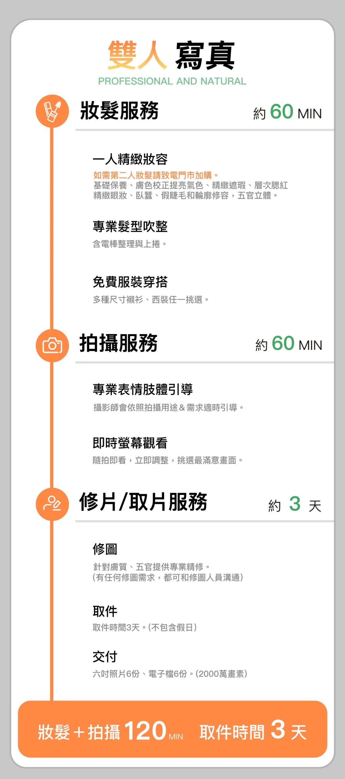 - 重點妝髮內容:輕透底妝或遮瑕、眼部上妝、氣色口紅、髮型梳順,會依現場情況有所取捨,若有重點加強的部位可與造型師討論。