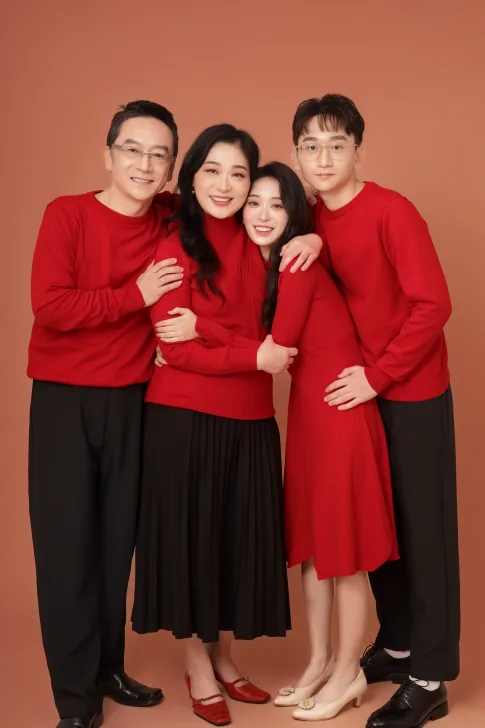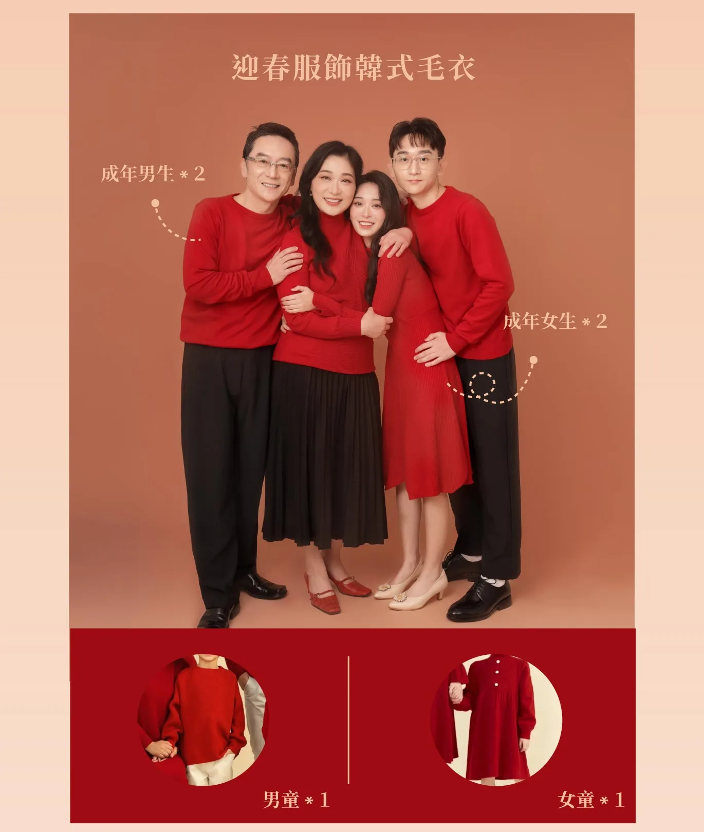 韓式毛衣:提供全家福紅色系針織毛衣,建議搭配黑色與暖色系下裝,整體溫馨,營造出輕鬆自然的家庭氛圍。