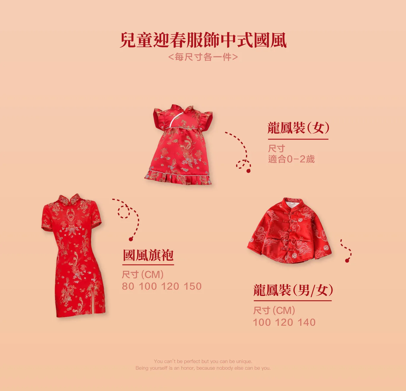 中式國風(兒童版):提供兒童款龍鳳裝、國風旗袍,小朋友也要可愛又有氣質。
