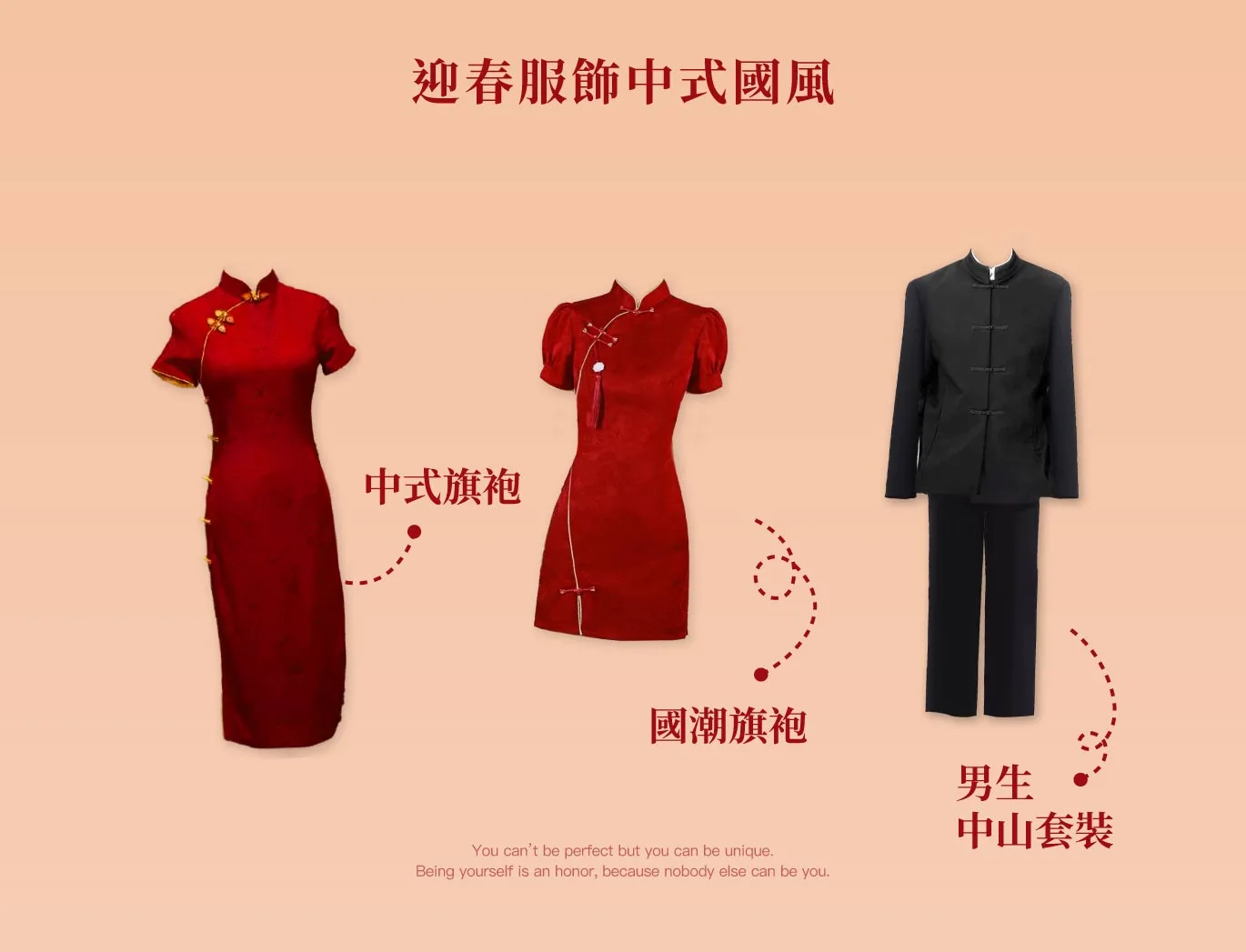 中式國風:提供女性經典紅色旗袍,凸顯了東方的優雅與端莊;男性則選擇傳統中山裝,展現穩重而富有內涵的氣質。