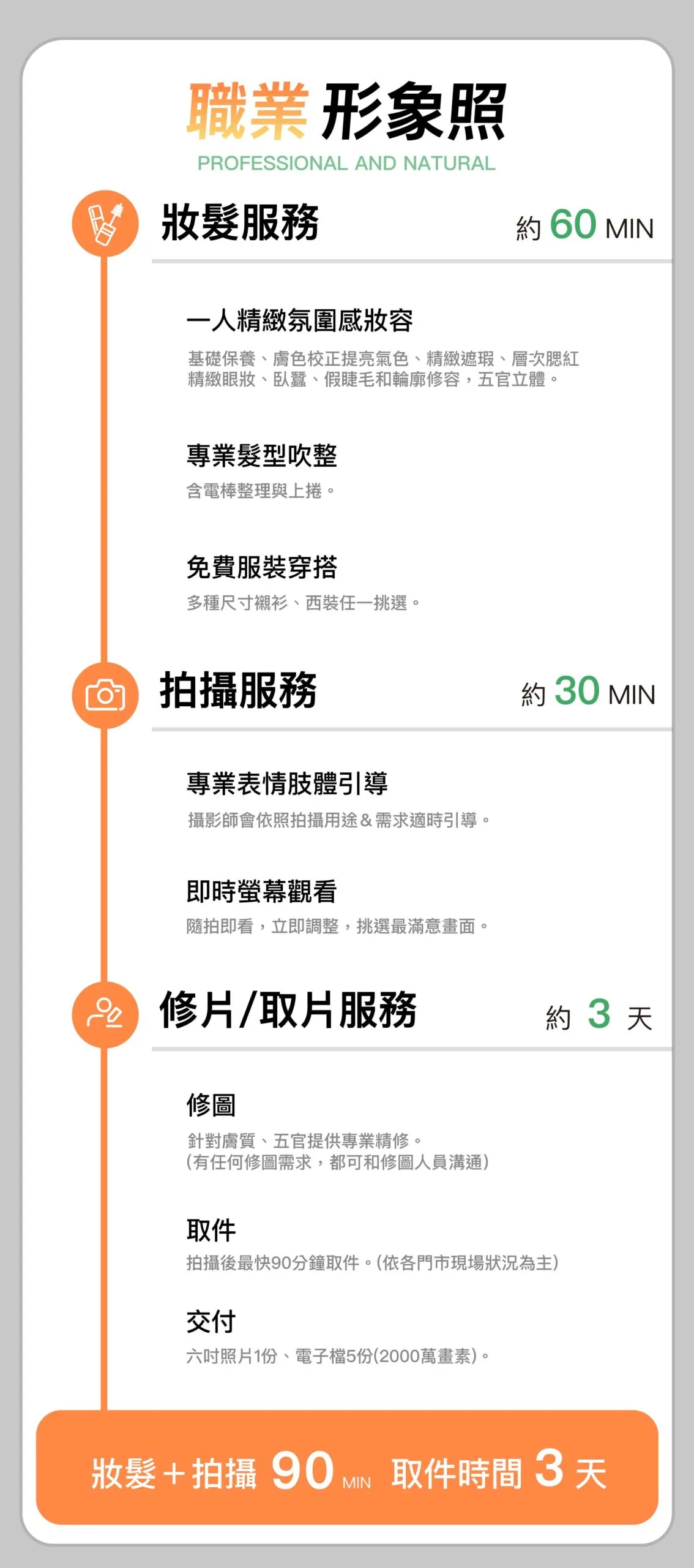 • 拍攝後修圖師會告知回來校稿的時間,形象照視店內當日情況約90分鐘/一張。