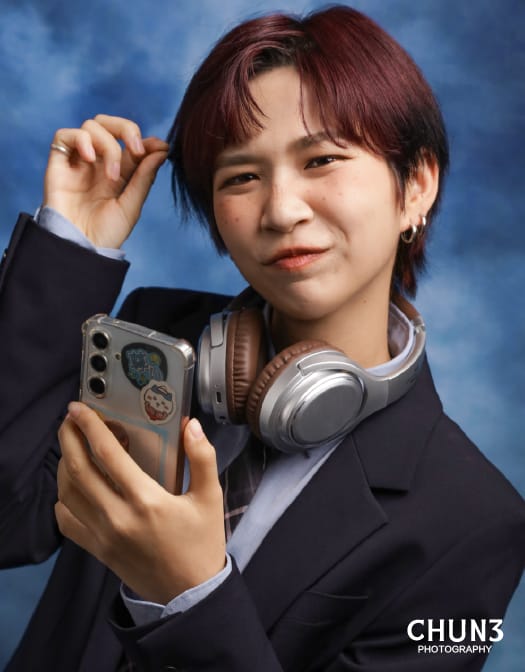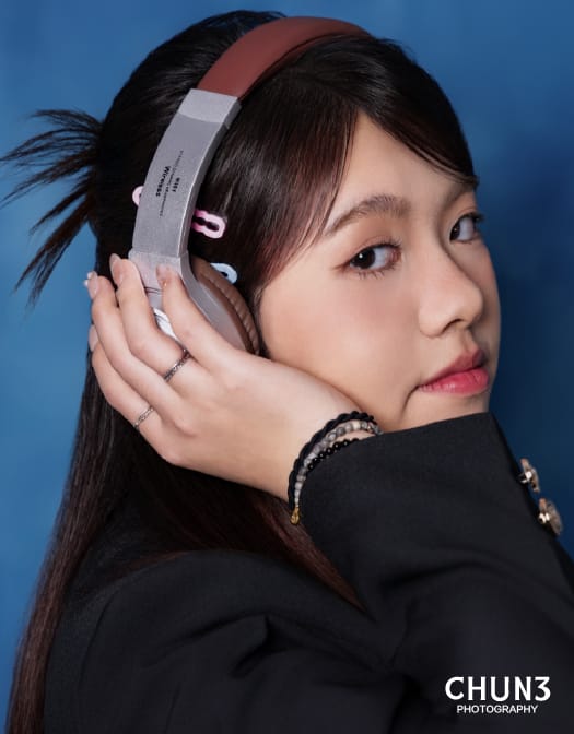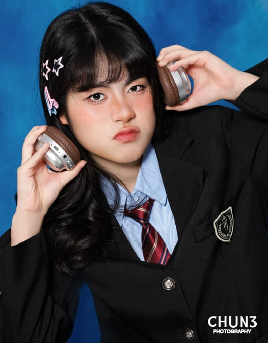 充滿經典魅力的攝影冒險!在深藍背景的襯托下,整體造型散發出知性與青春並存的氛圍。